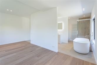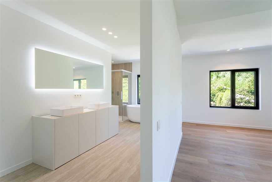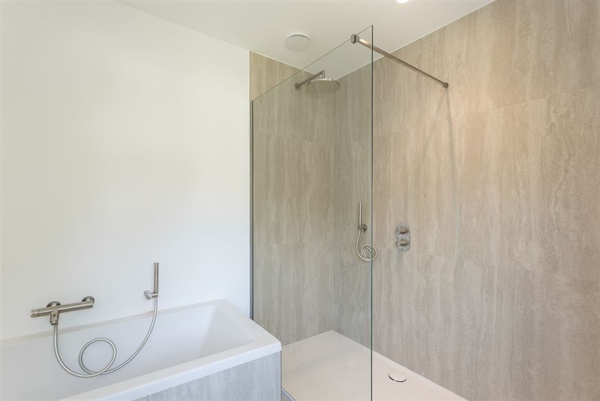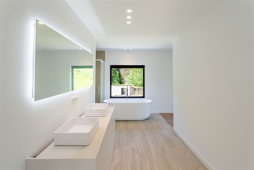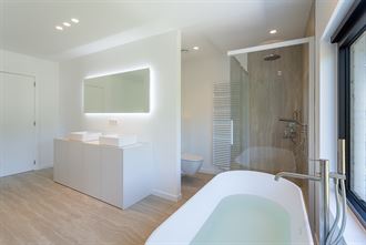 Dubbele lavabo, hang WC, ligbad, inloopdouche en sierradiator