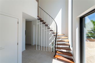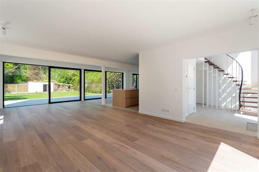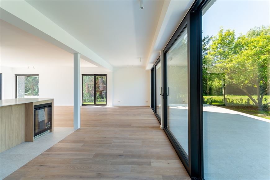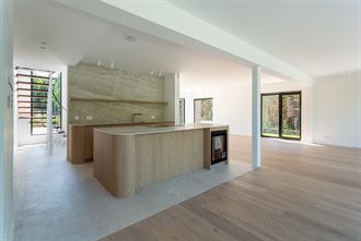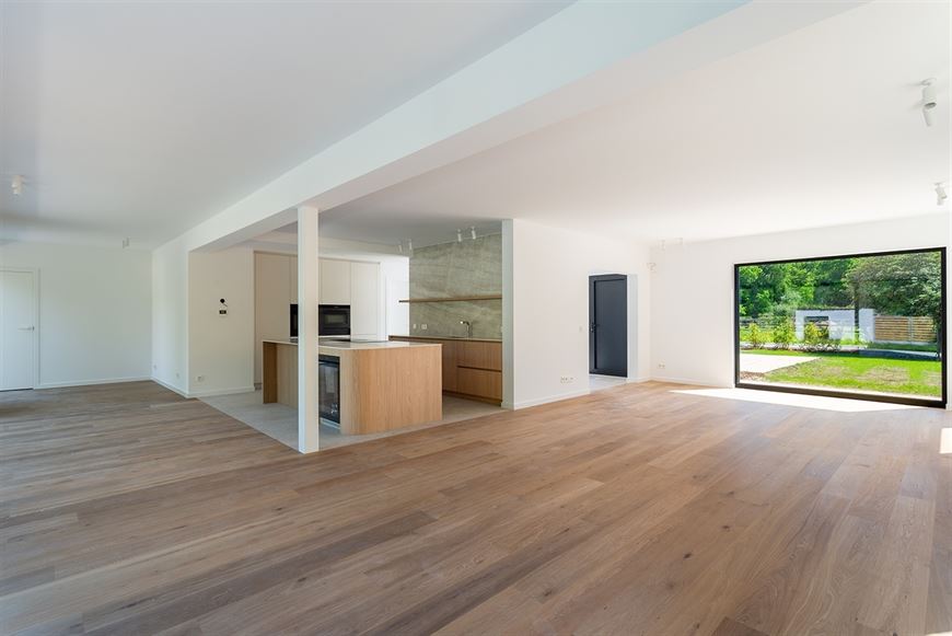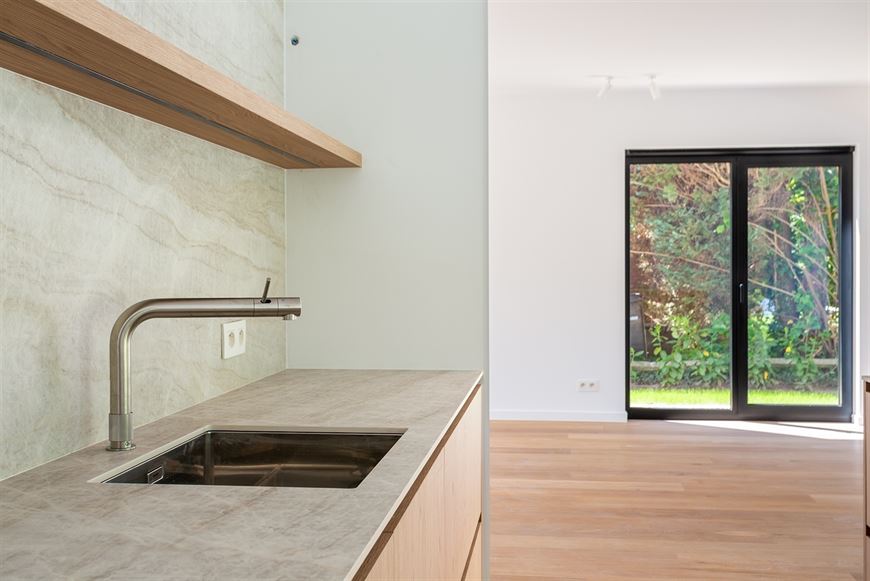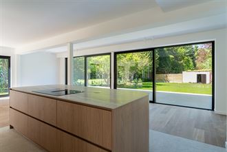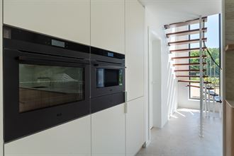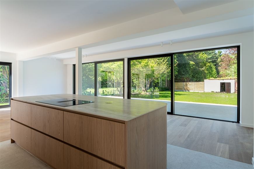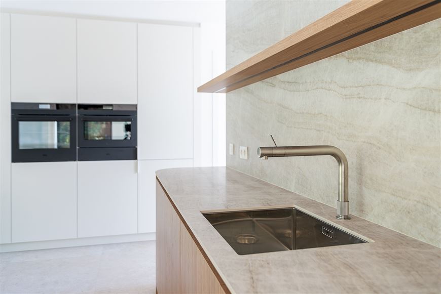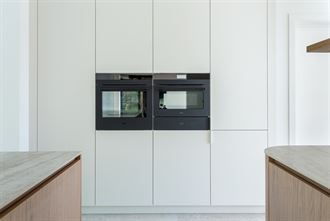 Ingerichte open keuken voorzien van spoeltafel, vaatwas, inductie kookplaat met geïntegreerde dampkap, wijnkoelkast, oven, combi-oven en frigo met 3 lade diepvries.
