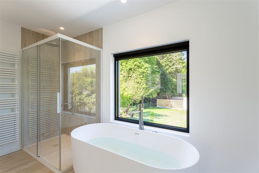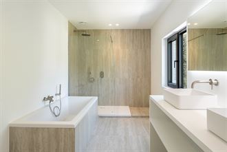 Dubbele lavabo, ligbad, inloopdouche en sierradiator