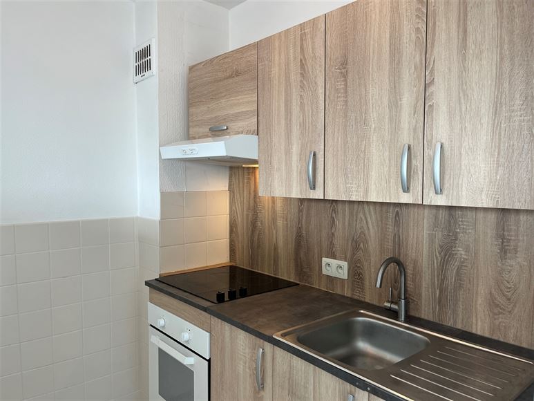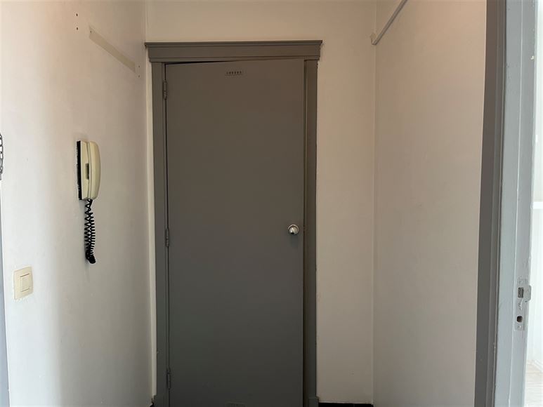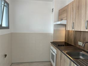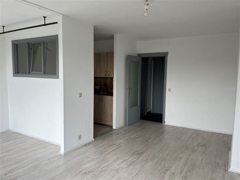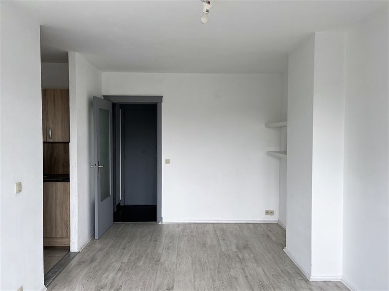 Centraal gelegen studio omvattende een inkomhal, woonkamer met halfopen keuken, leefruimte met slaaphoek, badkamer met zitbad, toilet en lavabo met meubel, alsook aansluiting voor de wasmachine.