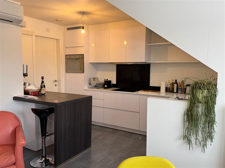 Het appartement omvat een living met open keuken en aansluitend wasplaats, gastentoilet, inkomhal met vestiaire, slaapkamer en badkamer. Verder ruim zonneterras.