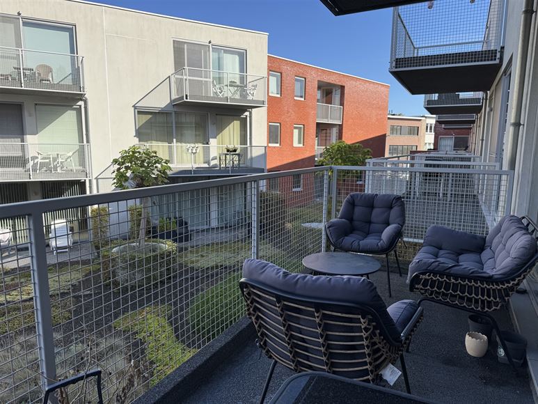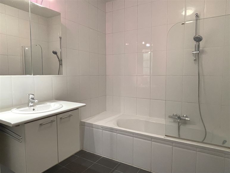 Ruim appartement omvattende inkomhal, woonkamer met open keuken met aansluitend terras van 10m², 2 slaapkamers, badkamer met ligbad, apart toilet en wasberging.